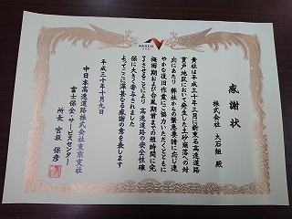 中日本高速道路株式会社より感謝状 授与