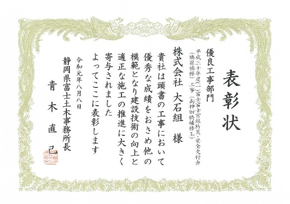 今年3月に竣工した、富士土木事務所発注の南神田橋補修工事が、難しい条件下での対応や、自主的に行った補修などが評価され、富士土木事務所長より優良工事として表彰されました。