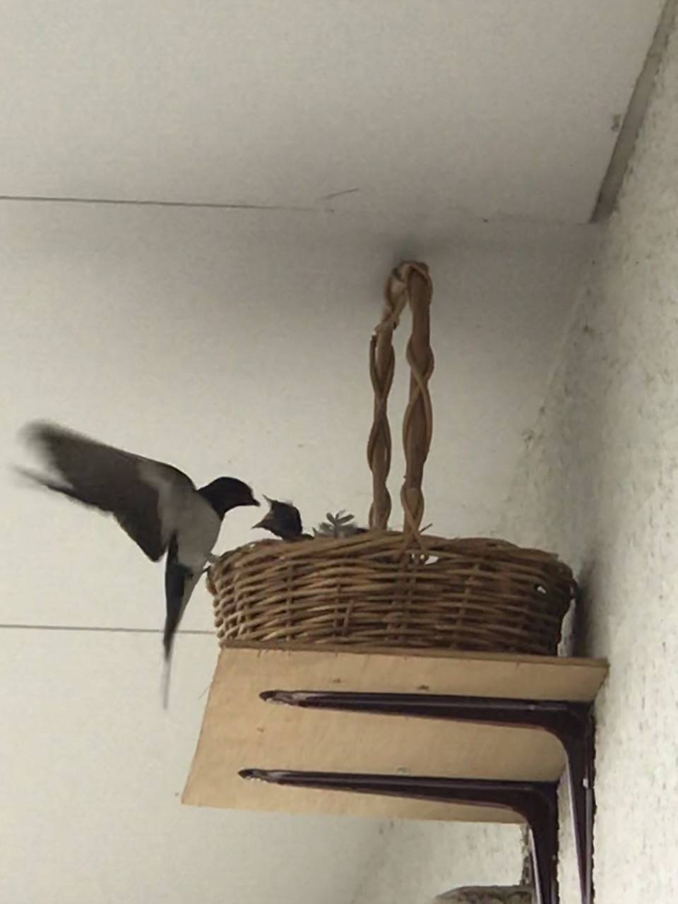 最初、親ツバメは警戒しているのか、なかなか新しい巣に近寄らず、ハラハラしましたが、しばらくすると巣に顔を突っ込むように。