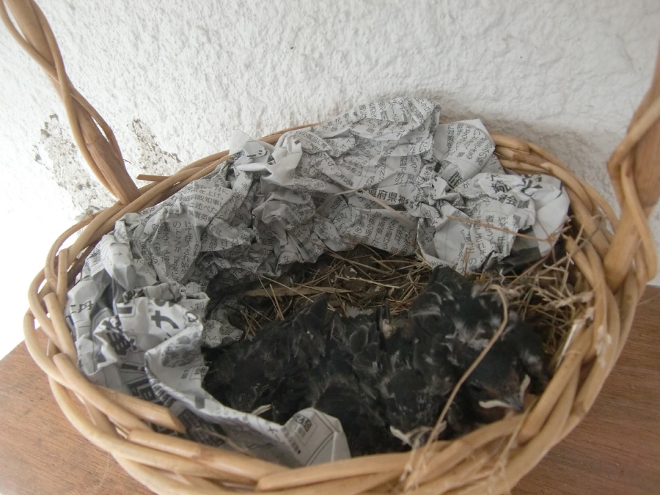 とにかくヒナを戻さなければと、室外機の下に入り込んだ蛇を追い出し、巣の代わりのカゴにヒナを入れて、巣があった場所の近くにカゴを設置。